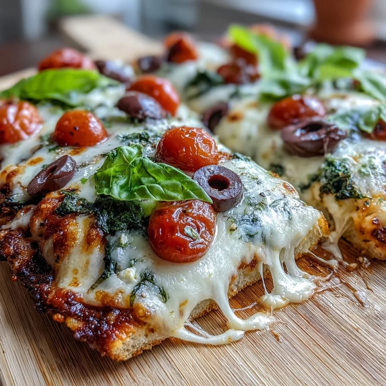 I first served this flatbread pizza at a last-minute dinner with friends, and their delight was loud and gratifying. We'd all been craving pizza but wanted something energizing rather than heavy. The moment I sliced into the cheesy topping and heard everyone cheer as gooey strands stretched from the crust, I knew I had a new staple. The toppings became a group effort: olives from the pantry, tomatoes picked by a neighbor, and one friend insisted on adding spinach for "vitamin flair." Sharing the process brought us together, proving pizza night isn’t just about the meal, but about creating memories.