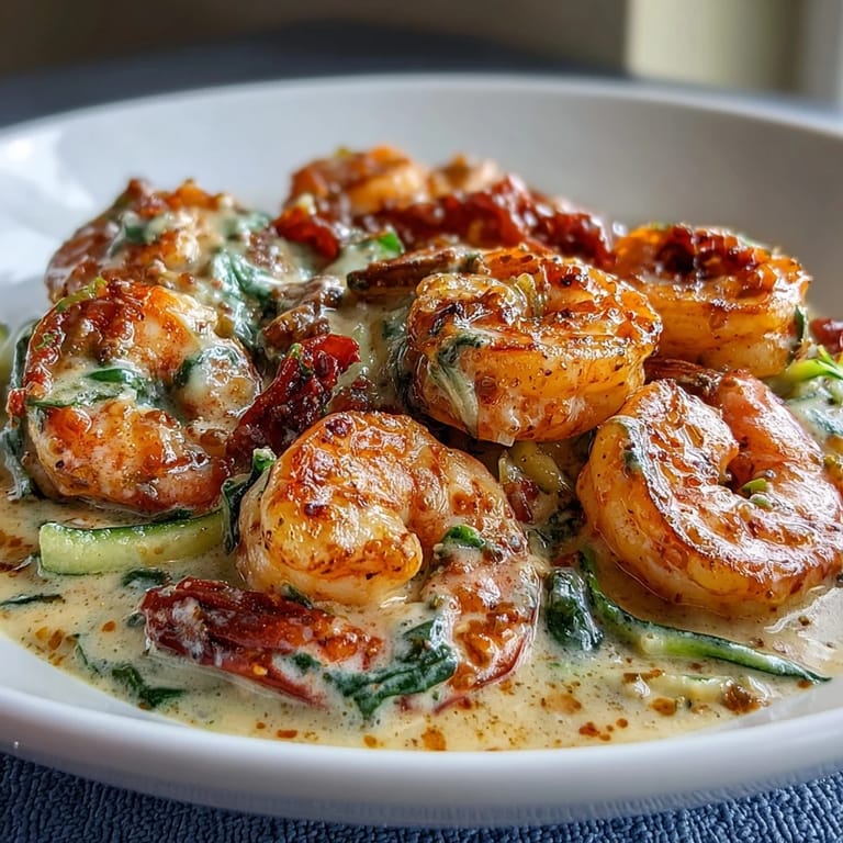 Pin it There's something about the sizzle of shrimp hitting a hot skillet that makes me feel like I'm cooking in a little Italian trattoria, even if it's just my weeknight kitchen. This Tuscan shrimp came together one evening when I was craving something creamy and indulgent but didn't want to abandon my low-carb goals. The garlic-infused cream sauce practically glows with sun-dried tomatoes and fresh spinach, and the zucchini noodles keep everything light without sacrificing any richness. It's the kind of dish that feels fancy enough for company but simple enough to throw together between work and dinner.